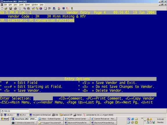The Perfection Software Electronic PO Transfer depends on setups made in the Vendor Entry program. Certain entries must be made before a transfer can take place. In Perfection Management, go to Vendor Entry (7.6.1 or 3.5.1.1), page 2-4, entries 19-30. Remember to Save the Vendor File when you are done.